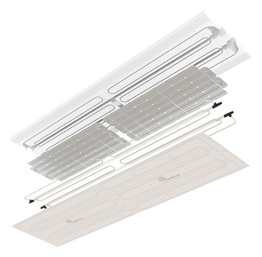 UT Beams ist ein vorgefertigtes Strahlungspaneel zur Montage in Decken mit sichtbaren Holz- oder Metallträgern.
