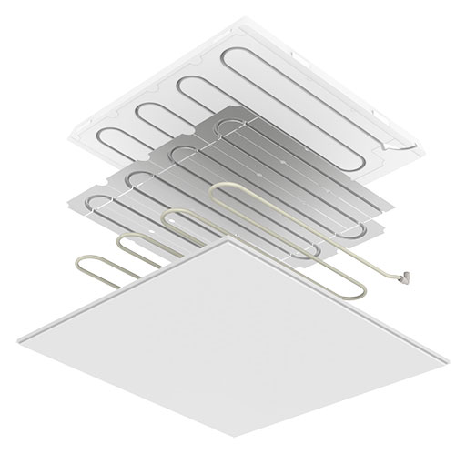 Herausnehmbares, vorgefertigtes Strahlungspanel 60x60 cm, komplett mit zwei 90°-Schnellkupplungen.